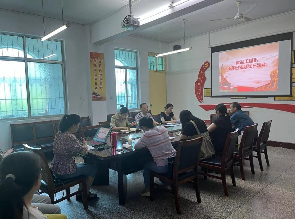 为全面深入学习贯彻落实党的二十大精神,把习近平新时代中国特色社会主义思想转化为坚定理想、锤炼党性和指导实践、推动工作的强大力量,6月14日,食品工程系党总支在系党建活动室开展六月份主题党日活动,本次活动由党总支副书记王新娜主持,并对此次活动进行总结,党总支书记贾新政出席会议,系领导班子和全体党员教师参会。