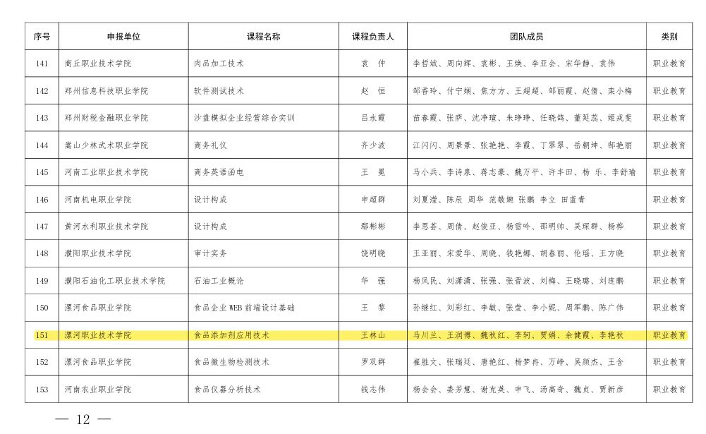 5月22日,河南省教育厅办公室公布了《关于2023年河南省职业教育和继续教育课程思政示范项目拟认定名单的公示》,365英国上市公司王林山副教授主持的《食品添加剂应用技术》课程入选河南省职业教育课程思政示范课程。由王林山、马川兰等人组成的365英国上市公司教师团队被认定为河南省职业教育与继续教育课程思政教学名师和教学团队。