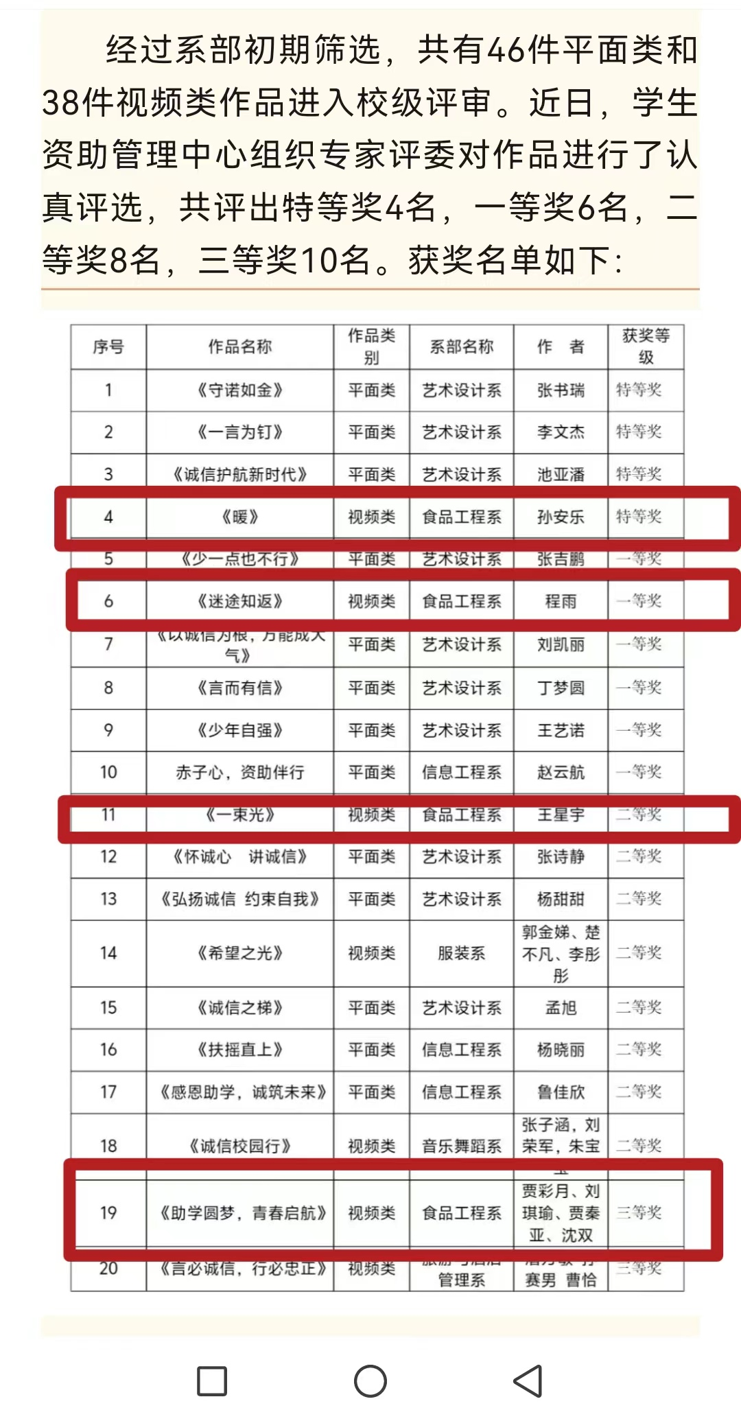 食品工程系在校资助中心举办的2023-2024学年度“诚信校园行”员工资助公益广告设计大赛中积极响应、精心组织,推出的4项作品全部获奖,获得特等奖、一等奖、二等奖、三等奖各1项。其中由孙安乐同学主创的微视频作品-《暖》在荣获校级特等奖的同时,被推荐至河南省教育厅参加省级“诚信校园行”员工资助公益广告设计大赛。