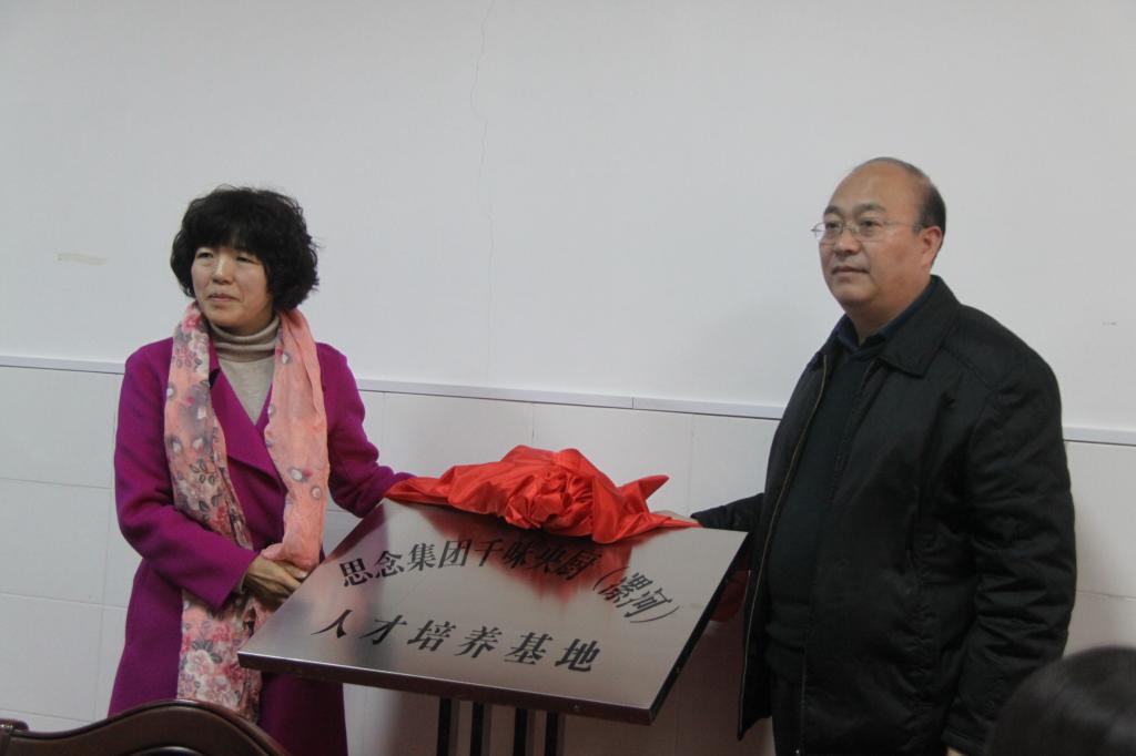 吴玉堂分别和陈瑞华、刘庆伟、苏玉霞在学徒制培养合作协议上签字并分别为郑州市仟吉食品(漯河)烘焙学院、思念集团千味食品(漯河)人才培养基地和天瑞集团(漯河)营养与健康管理学院揭牌。