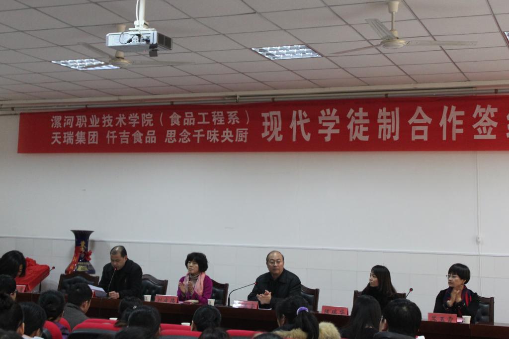 公司作为100所全国现代学徒制试点院校之一,学院领导高度重视项目建设工作。今年以来,食品工程系根据教育部《现代学徒制工作实施方案》和食品工程系《现代学徒制试点工作任务书》的要求,积极寻求合作伙伴,最终确定与思念集团郑州千味央厨食品有限公司、郑州市仟吉食品有限公司和济南天瑞健康信息咨询有限公司三家单位进行学徒制合作。并经校企双方多次沟通研讨,将合作方提供的6-10门岗位课程纳入人才培养方案,培养方案框架已经形成,实现了课程改革的新突破;探索构建了“六段四双一体化育人”人才培养模式(六段即学徒1、2、4学期在学校,3、5、6学期在企业,四双即校企双主体育人、学徒双重身份、双导师队伍、双课程设置,一体化育人即合作双方建立与现代学徒制相适应的协商联动、合作培养、责任共担、资源共享、互聘共用、三方共赢的一体化运行机制),经双方共同动员、按照员工自愿的原则,分别有104名员工加入了2015级仟吉食品、2015级千味央厨、2015级知心天瑞、2016级仟吉食品、2016级千味央厨等五个学徒制班,实现了培养模式的新跨越;共同成立了思念集团千味食品(漯河)人才培养基地、郑州仟吉食品(漯河)烘焙学院、天瑞集团(漯河)营养与健康管理学院,并由王变奇副经理担任经理或主任,由合作方副总裁任常务副经理或副主任,搭建了校企合作管理的新平台。