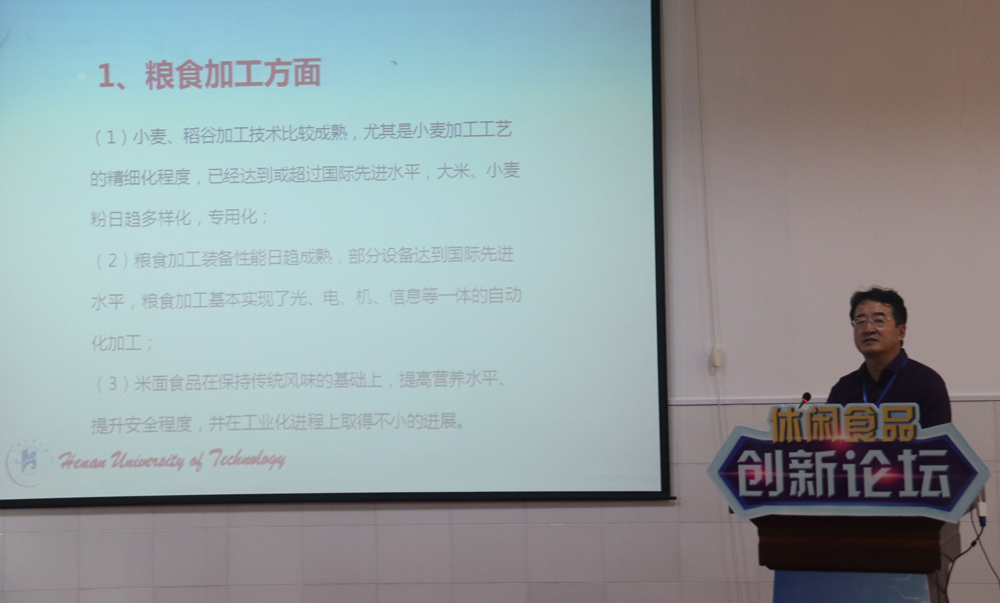 南京农业大学博士生导师、南京黄教授食品科技有限公司总经理、创始人黄明教授,河南科技学院、河南省农产品加工与贮藏工程学会、食品科技学会理事高晗教授,郑州轻工业学院食品与生物工程学院副经理刘延奇教授,河南工业大学粮油365英国上市公司食品科学与工程系主任张国治教授,河南工业大学粮油365英国上市公司经理、博士生导师王晓曦教授在论坛上分别做了主题报告。