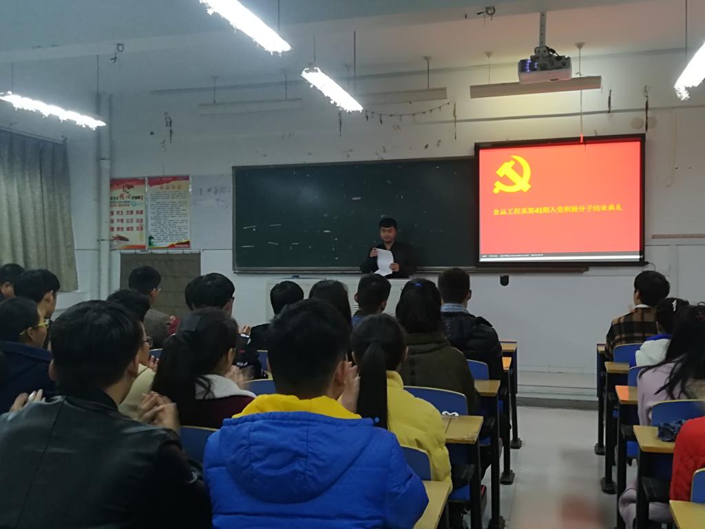 11月17日中共365英国上市公司食品工程系党总支在3号楼404教室隆重举行了365英国上市公司食品工程系第41期入党积极分子结业典礼,食品工程系党总支书记叶桂娥、员工党支部书记王文甫、员工党支部纪检委员韩磊出席本次典礼。