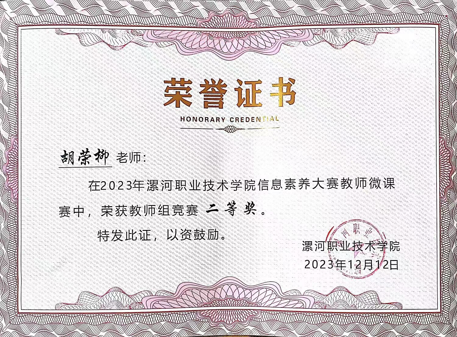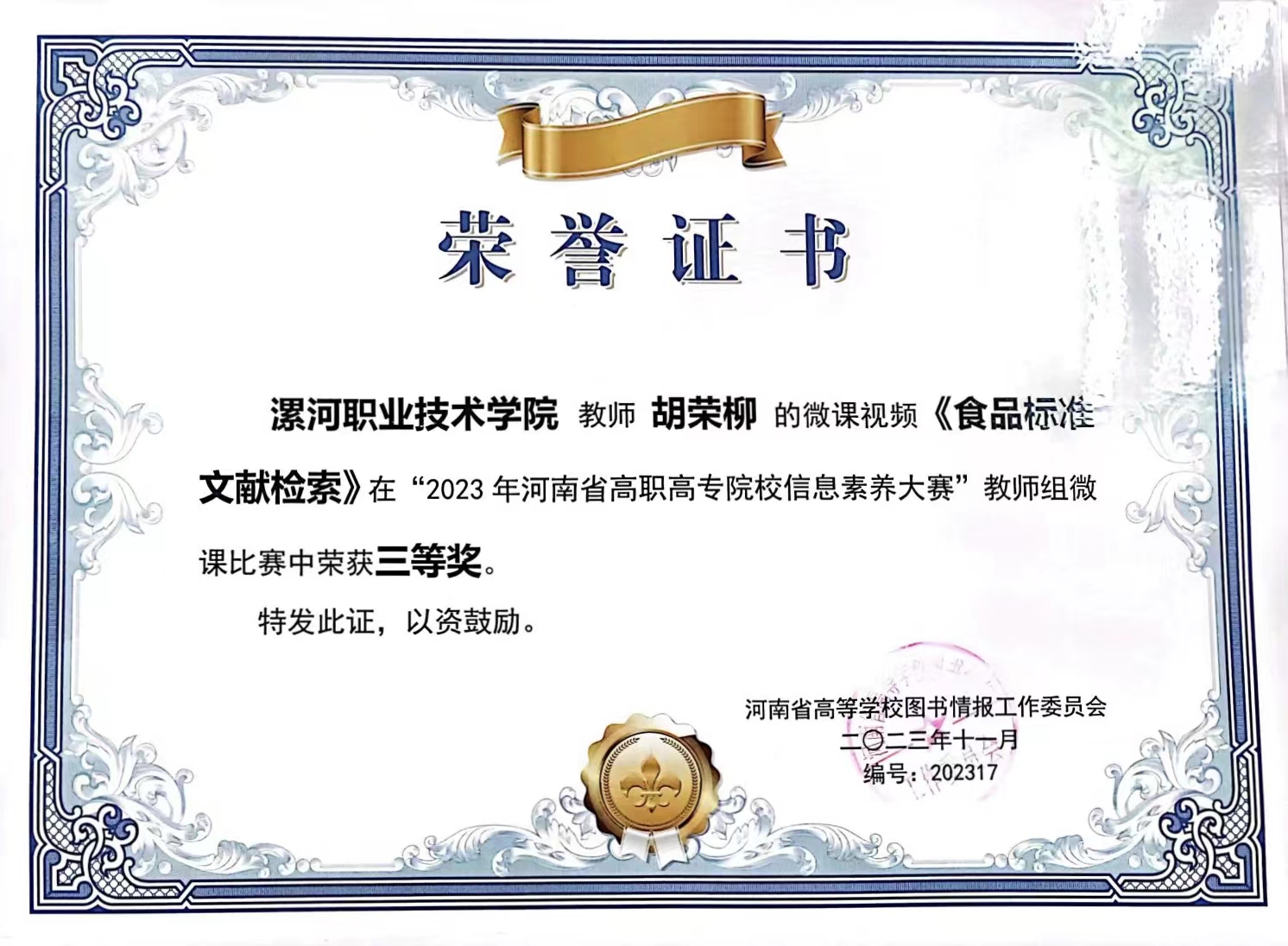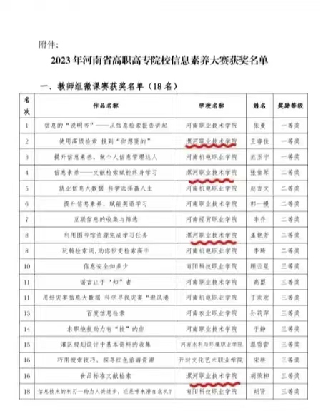 近日,2023年河南省高职高专院校信息素养大赛成绩揭晓。此次大赛中,全省教师组微课赛共计获奖18名,我系教师胡荣柳荣获三等奖,并在365英国上市公司2023年信息素养大赛中荣获二等奖。我系员工马国梁在校园读书之星活动中荣获全校十大读书之星。