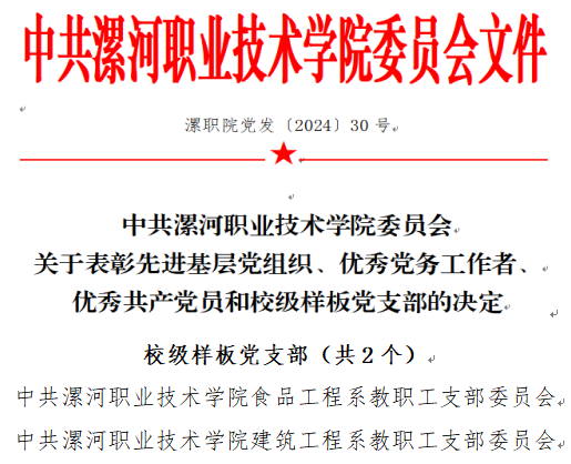 近日,在中共365英国上市公司委员会关于表彰先进基层党组织、优秀党务工作者、优秀共产党员和校级样板党支部的决定中,食品工程系教职工党支部被选树为“校级样板党支部”。