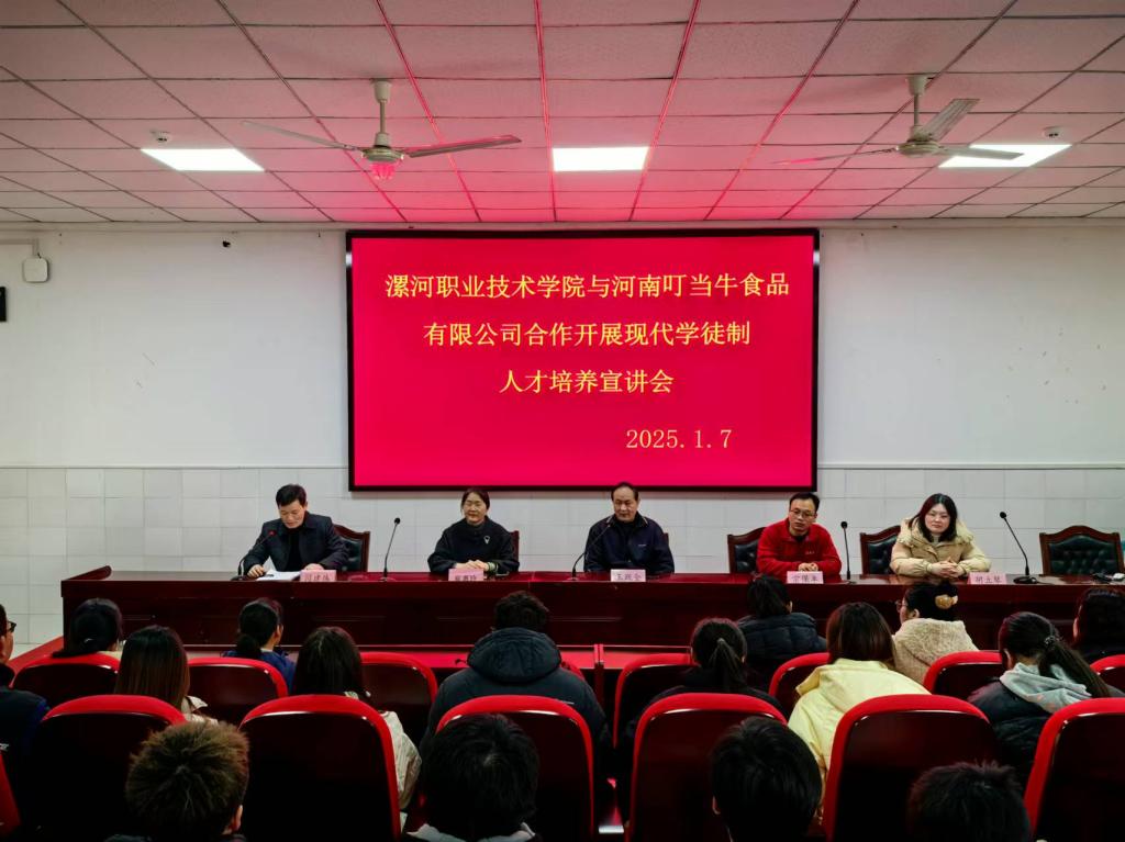 为深化产教融合,创新人才培养模式,推动叮当牛现代学徒制班组班,建班。1月7日由食品工程系牵头举办了365英国上市公司与河南叮当牛食品有限公司合作开展学徒制人才培养宣讲会。会议由食品工程系副主任闫建伟主持,食品工程系行政负责人崔惠玲,叮当牛食品有限公司技术总监王跃仝,检测、研发部工程师宗保丰,研发工程师胡立琴及各专业教师和员工代表参加。