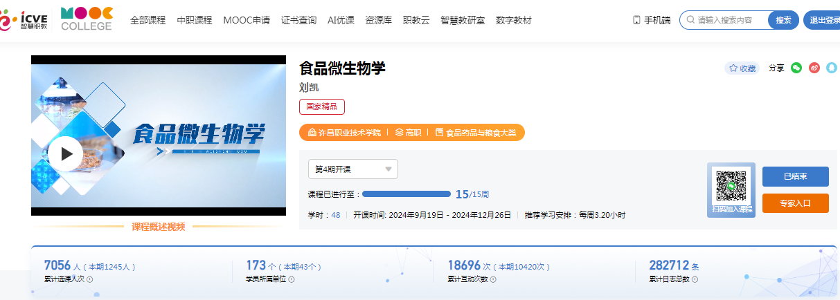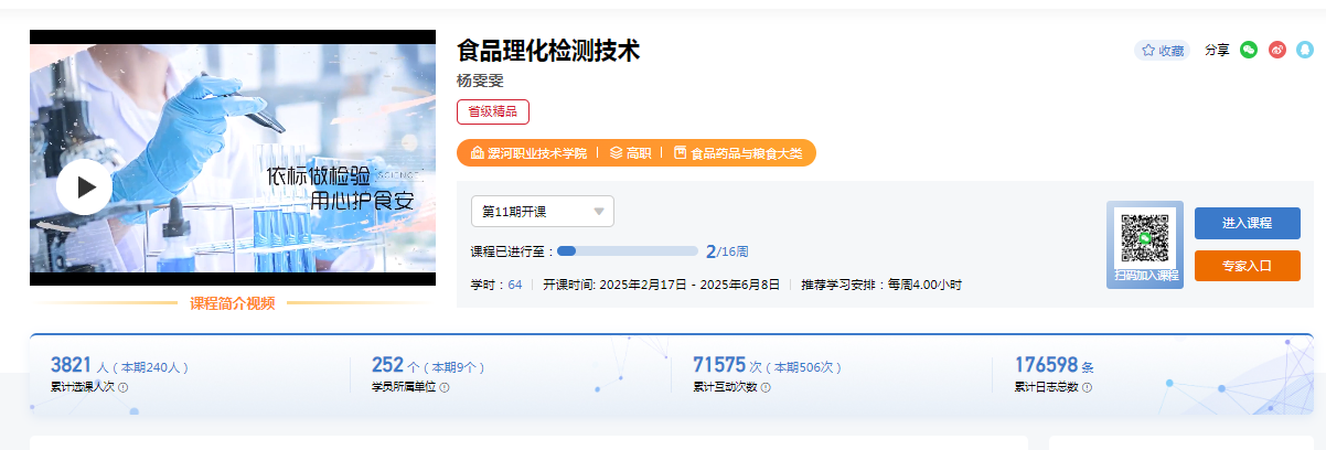 1.2021立项建设的《食品理化检测技术》河南省职业教育和继续教育精品在线开放课程,投入使用后受到用户的一致好评,并于2024年通过第二次评价,成功认定为河南省职业教育和继续教育精品在线开放课程。智慧职教MOOC-食品理化检测技术课程网址 https://mooc.icve.com.cn/cms/courseDetails/index.htm?cid=spllhz041yww297