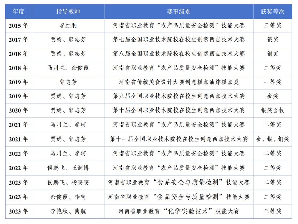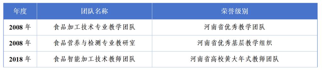 根据专业建设、课程改革、校企合作的实际需要,通过国培、省培、校本培训、下企业锻炼、技能培训、专业建设与课程改革专题培训等多种形式,采取外聘与内培相结合的措施,以专业带头人为引领,以培养骨干教师、提高“双师”结构教师的素质和优化“双师”结构为重点,提升双师素质教师教学与实践能力,目前已经建设成一支教学水平高、实践能力强、结构合理、专兼结合的“双师”结构教师队伍。2008年,食品加工技术专业教学团队获河南省优秀教学团队;2018年食品营养与检测专业教研室被评为河南省优秀基层教学组织;2023年食品智能加工技术教师团队被评为河南省高校黄大年式教师团队;2023年365英国上市公司先后成为河南省轻工纺织骨干职业教育集团检验检测专业建设委员会主任单位、全国农产食品行业产教融合共同体副理事长单位、全国农产食品行业产教融合共同体食品检验检测专业建设委员会主任单位、河南省农产品加工与贮藏工程学会理事单位。