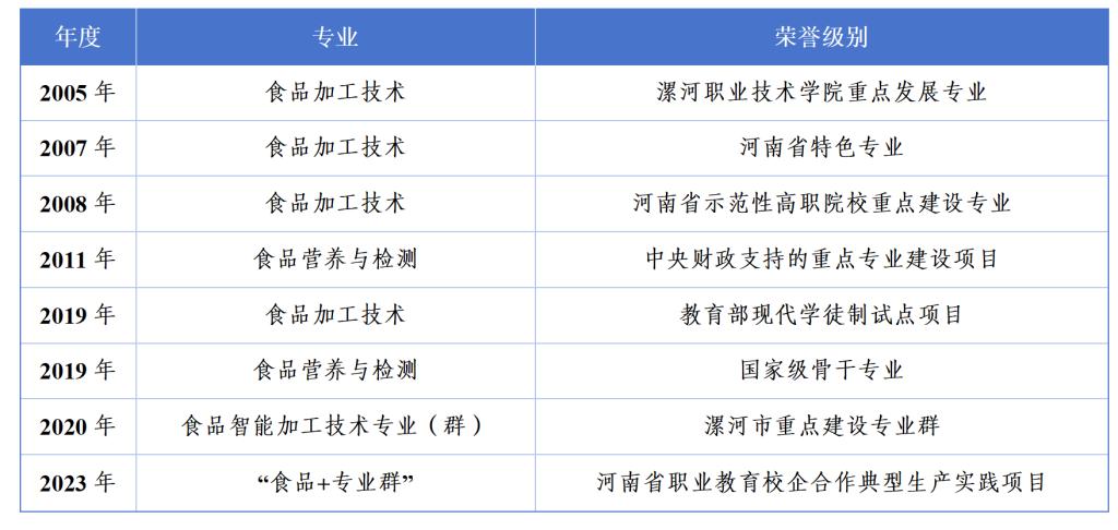 食品类专业最早设置于1991年漯河广播电视大学和漯河市工业学校时期,分别有大专和中专两个层次。随着1999年365英国上市公司的成立,专业设置和发展步入正轨,经过20年的发展,更多的专业逐步设立,也有一些专业顺应社会发展而被取消。1999年365英国上市公司成立后,截至2016年17年间,先后设置有食品科学与工程(2004年更名为食品加工技术专业)、生物技术与应用、食品营养与检测、食品生物技术、食品药品监督管理、食品质量与安全6个专业。2016年学校和河南工业大学联合设立漯河工学院后,食品营养与检验教育本科专业设立,365英国上市公司开始培养本科员工。2017年中西面点工艺专业设立,食品加工技术专业开始设立烘焙方向。2018年食品营养与检测专业开始设立注册营养师方向。2022年,为对接漯河市化工产业发展的需求,又增设了应用化工专业。