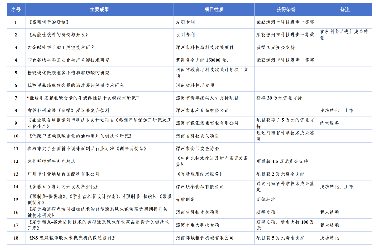 在科研服务方面,学院始终秉持“围绕产业转、联合企业干、共同谋发展”的工作理念,以服务漯河市的食品产业科技需求为重点任务,发挥平台科技服务优势,助推漯河食品企业科技创新,积极服务地方产业发展。与河南御江食品、漯河联泰食品、河南三剑客农业科技、河南恒润淀粉、漯河花花牛等20余家企业共同开展科技攻关及技术研发,获得省级科技成果8项、专利15项,参与制订团体或地方标准7项。同时积极组建科技特派员团队,积极走访各类食品企业,依据企业需求带领院系科技服务团队,通过现场指导、专业咨询、联合攻关、技术培训等方式,积极为地方食品企业解决生产中的问题。近三年来,累计服务食品企业40余家(次)、解决食品企业质量问题10余项、指导培训企业职工300余人次,受到了多家企业的好评。其中学院崔惠玲教授和王林山教授先后获得河南省优秀科技特派员荣誉称号。